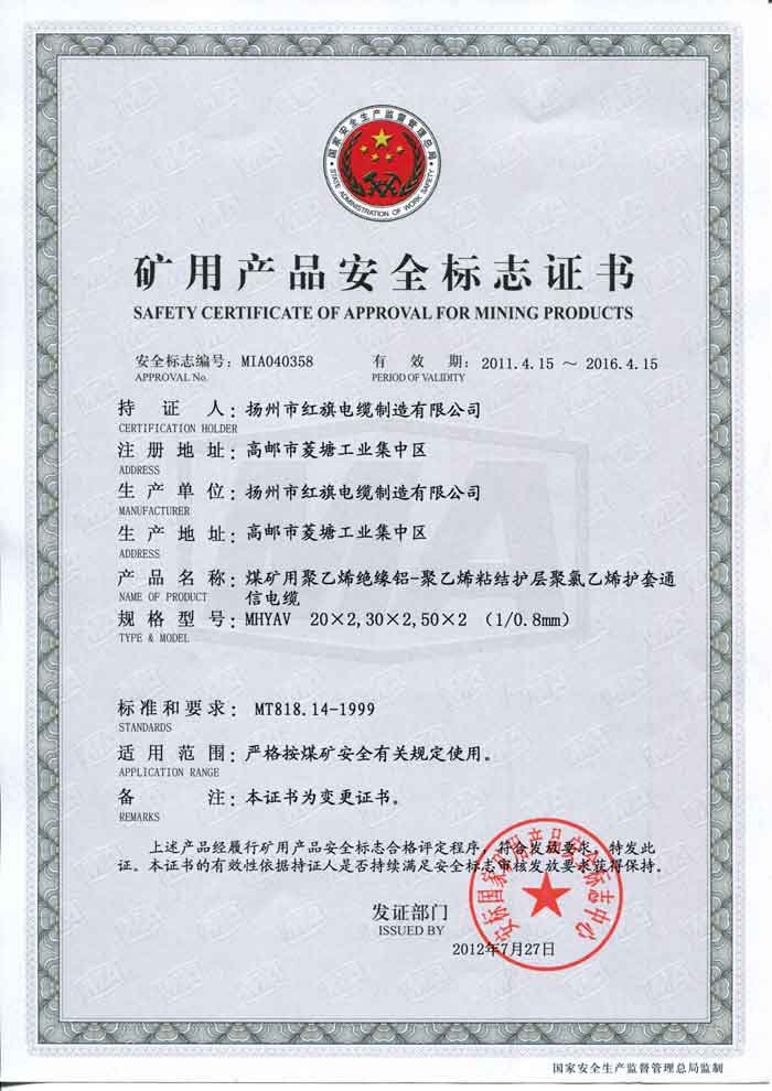 煤礦礦用產(chǎn)品安全標(biāo)志證書-MHYAV
