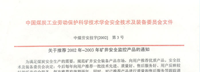 中國煤炭工業(yè)勞動保護科學(xué)技術(shù)學(xué)會安全技術(shù)及裝備委員會推薦2002-2003年礦井安全監(jiān)控產(chǎn)品的通知(我公司生產(chǎn)的礦用信號、通信電纜排名第一位)