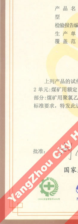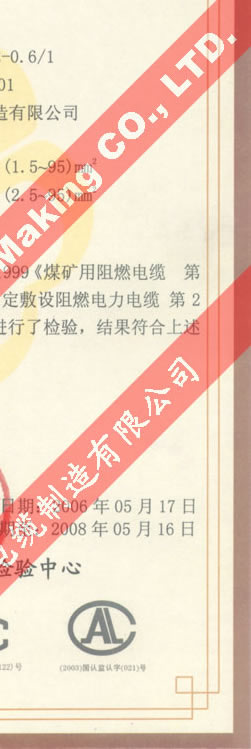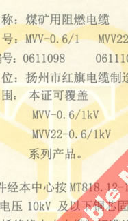 國家采煤機械質(zhì)量監(jiān)督檢驗中心檢驗合格證--煤礦用阻燃電纜(MVV-0.6/1 MVV22-0.6/1)